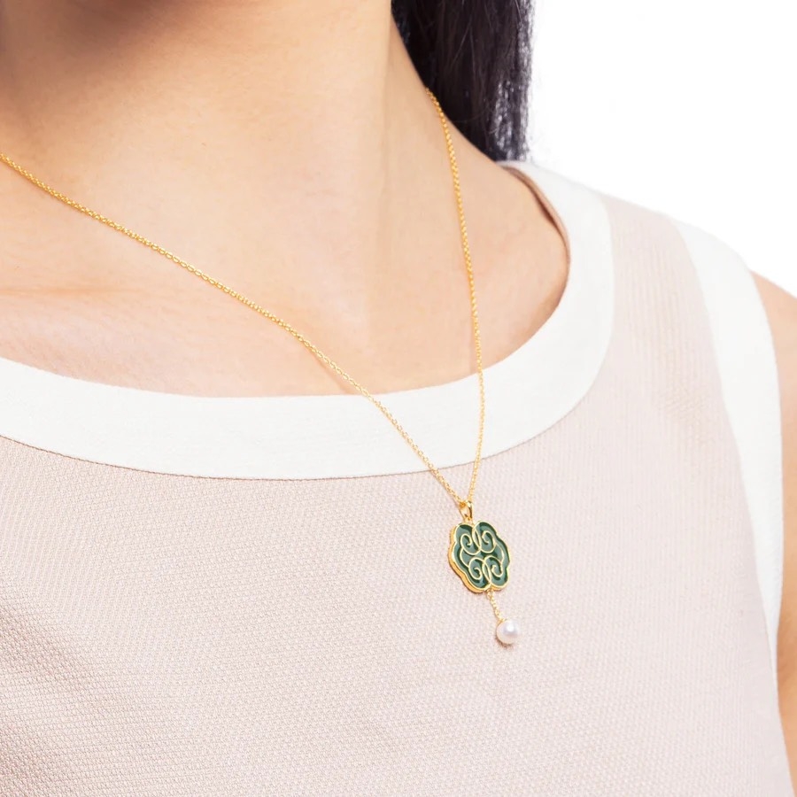 Bộ sưu tập trang sức Như Ý mạ vàng 18kt được thiết kế với hai mẫu hoa văn Như Ý ghép lại với nhau tạo thành một đám mây cân đối, kết hợp với những viên ngọc trai nước ngọt tròn trịa. Sự kết hợp này tạo nên một thiết kế biểu trưng cho niềm hạnh phúc trọn vẹn, thuần khiết và đáng trân quý.