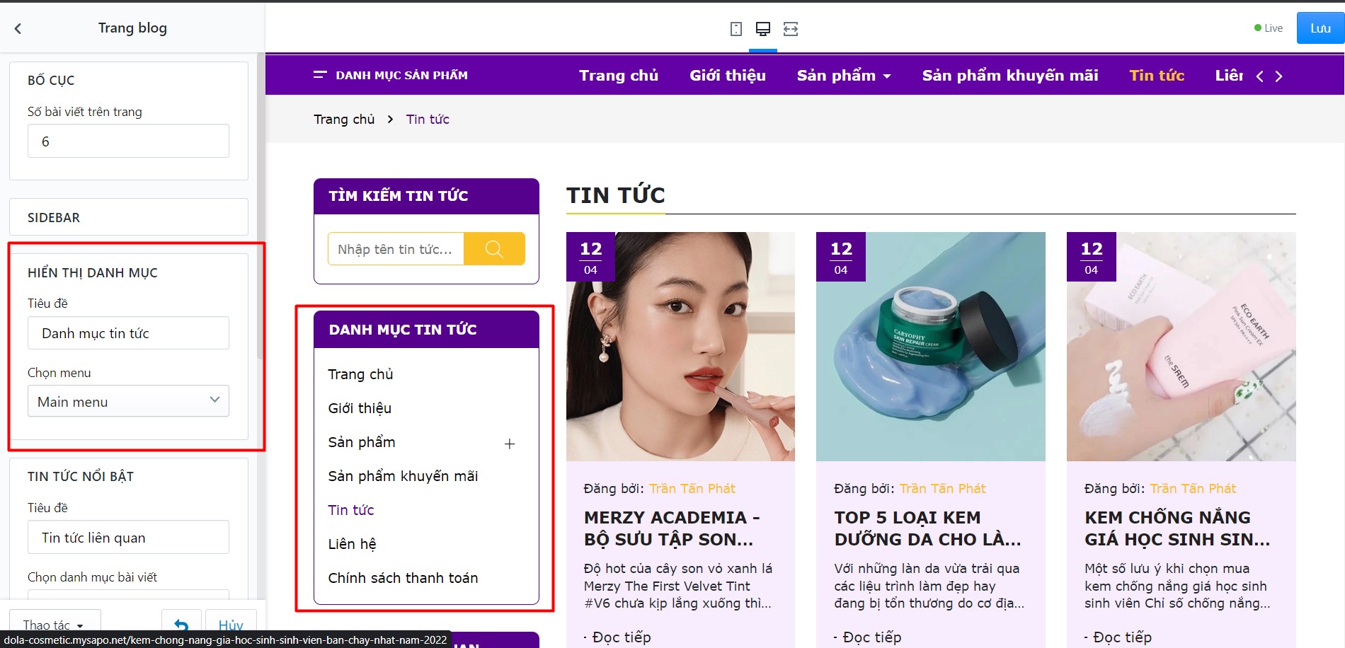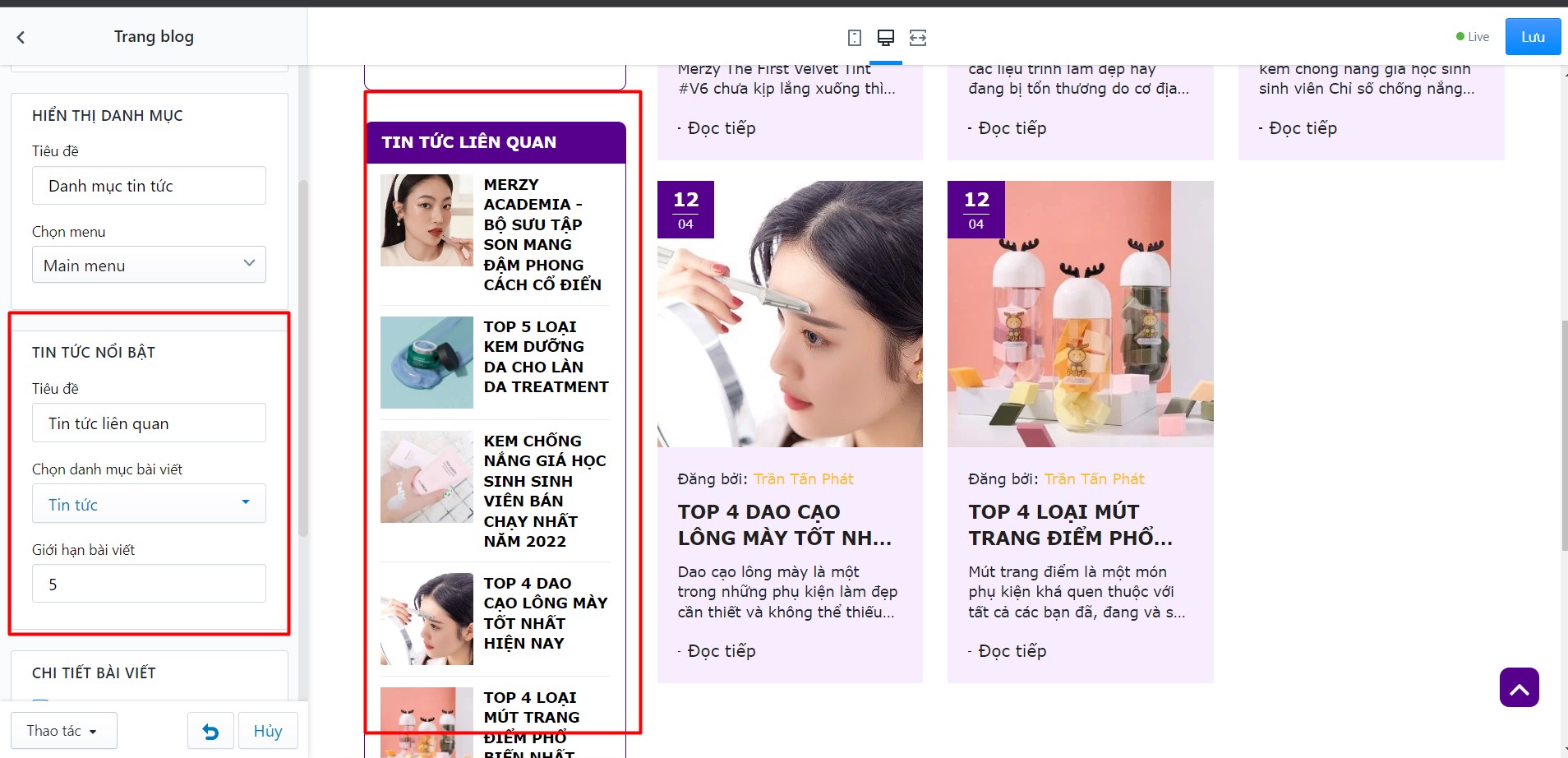 Tại đây, bạn có thể thiết lập số bài viết hiển thị trên 1 trang, danh mục, tin nổi bật