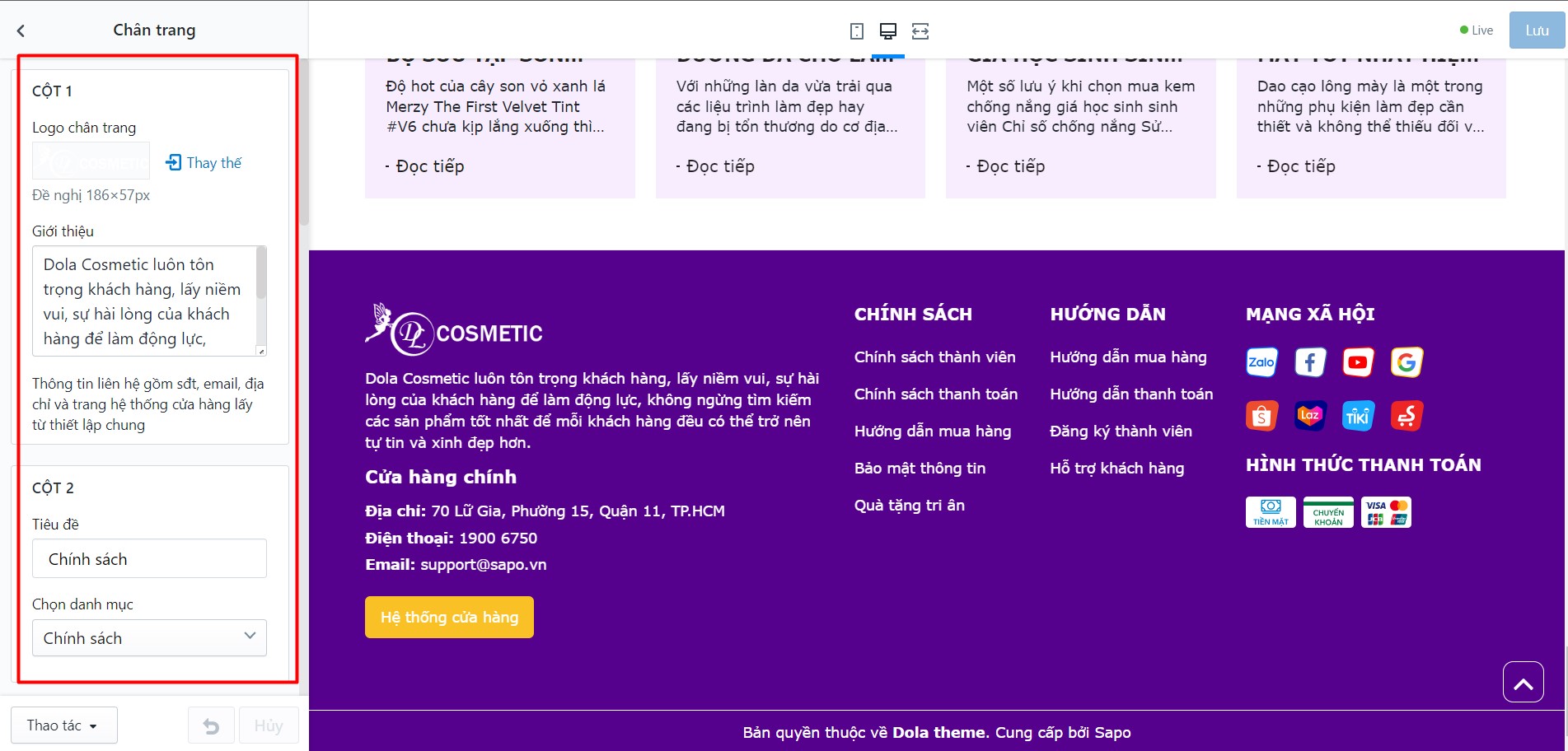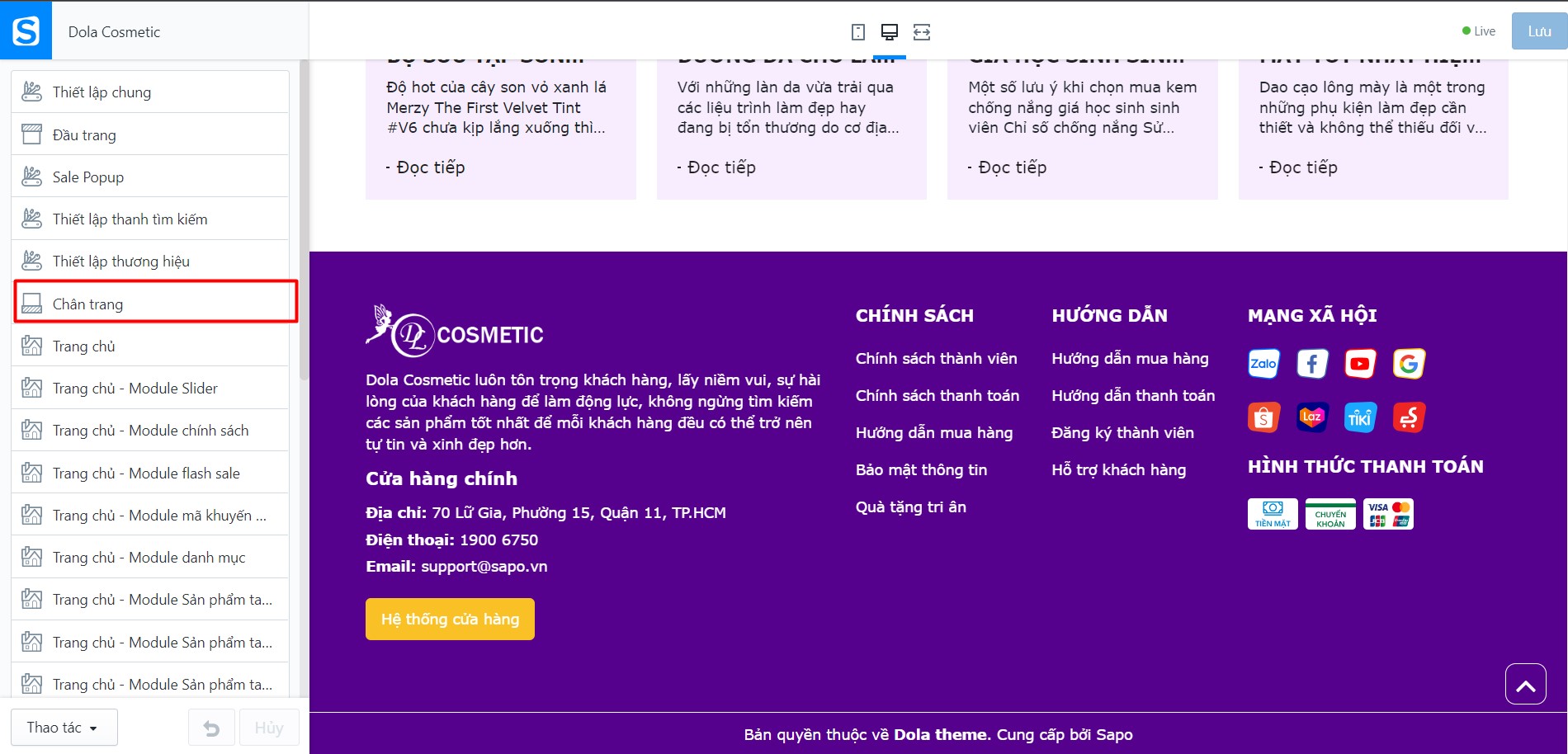 Để thiết lập chân trang, bạn cần tìm đến Chân trang: