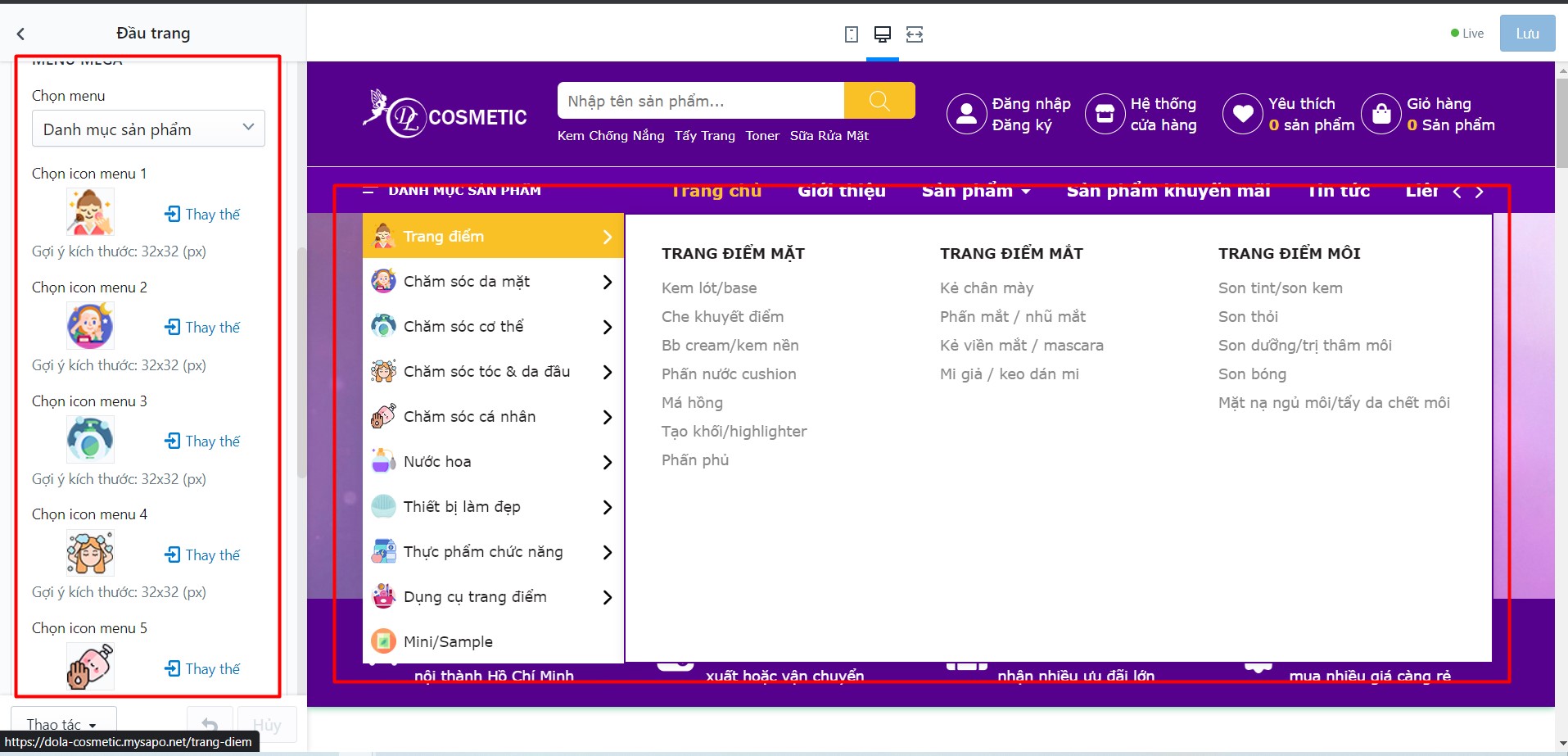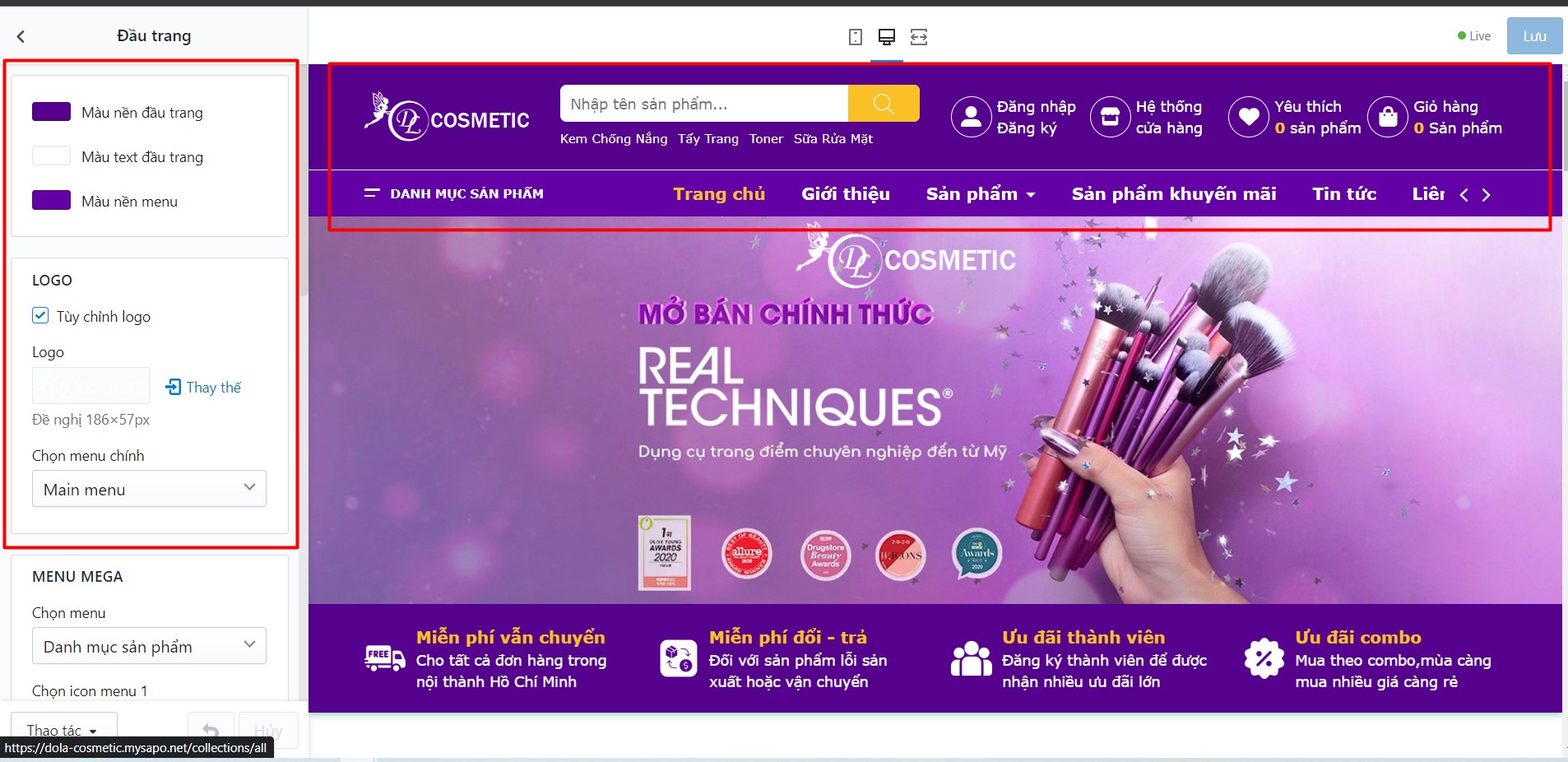 Tại đây cho phép bạn thay đổi tất cả các logo, Menu, Mega menu:
