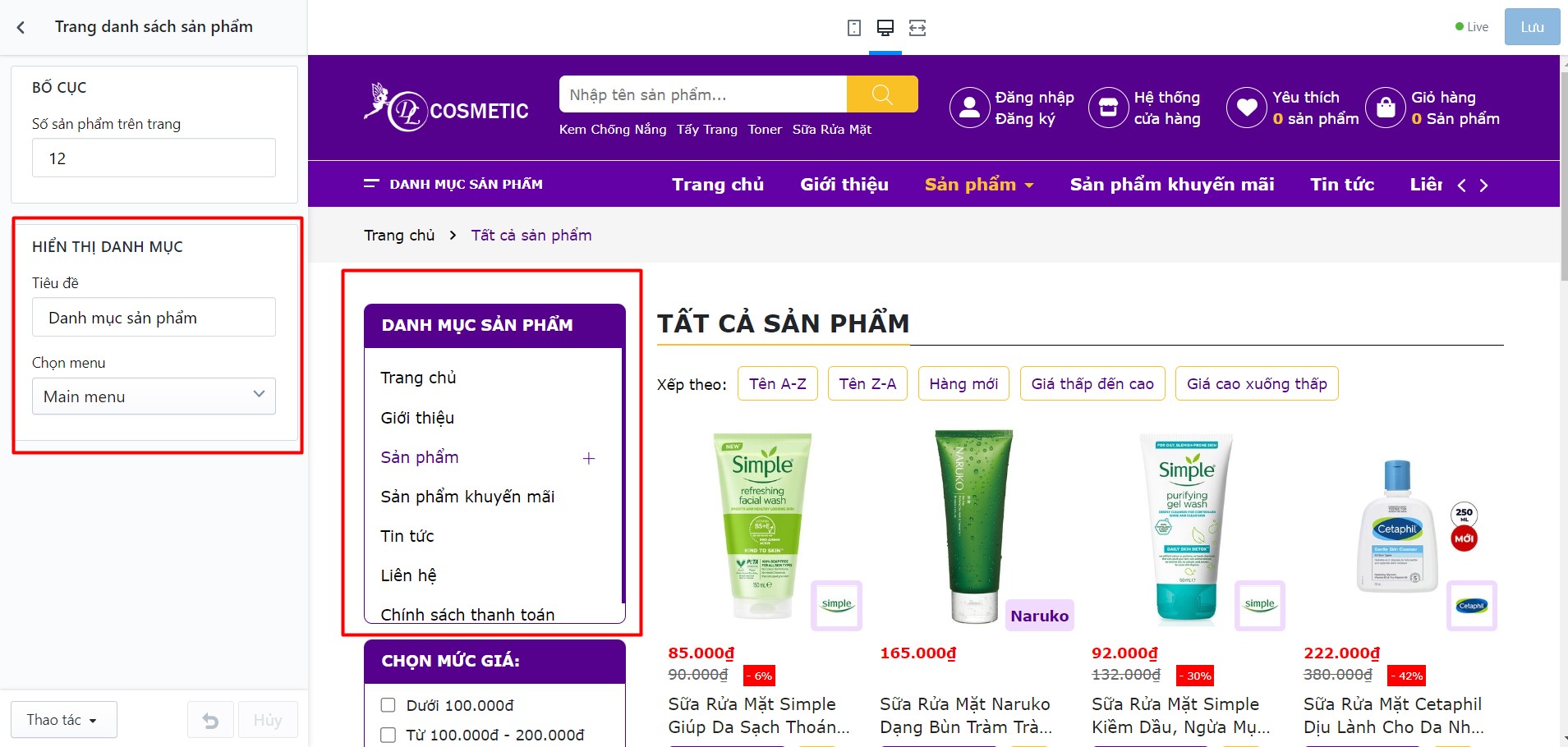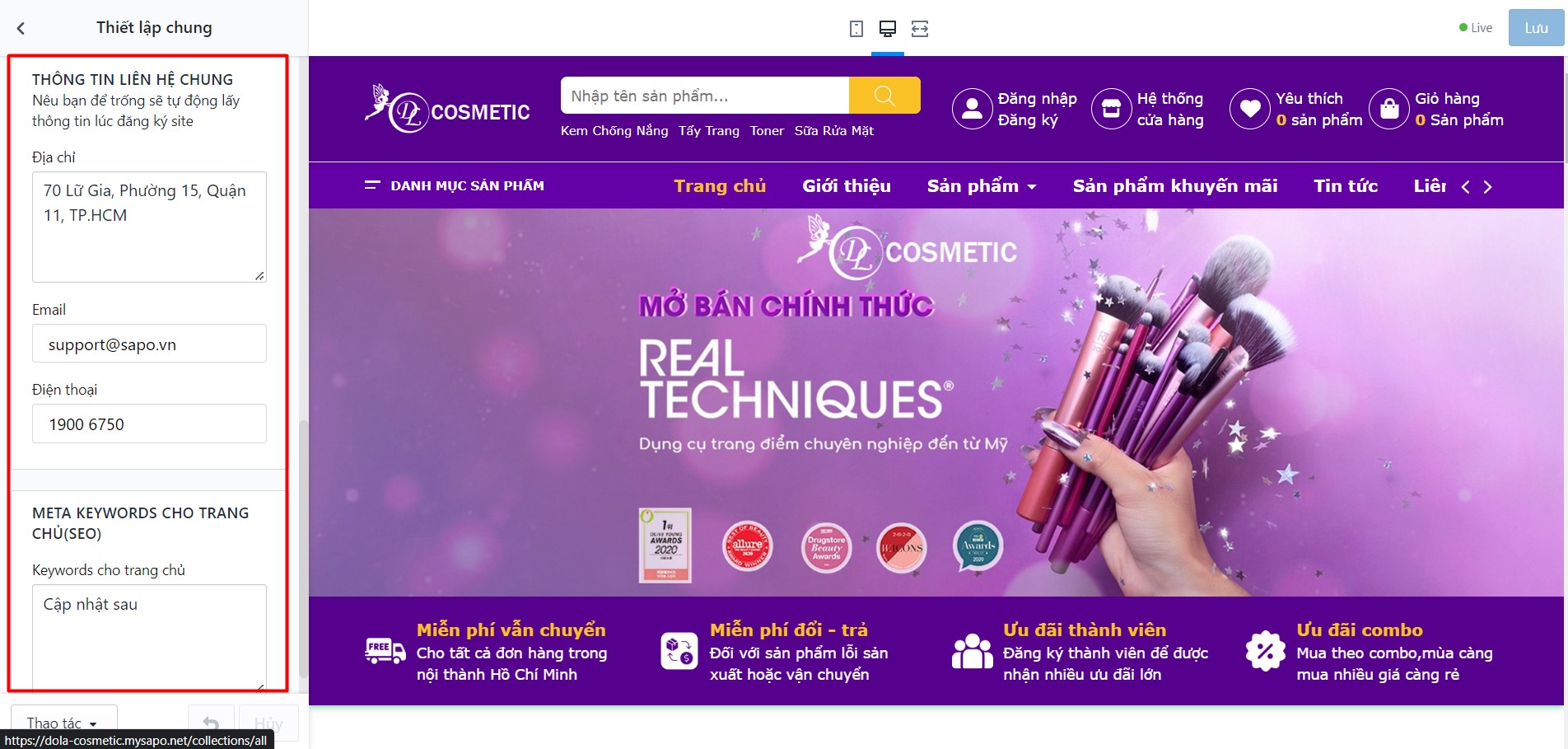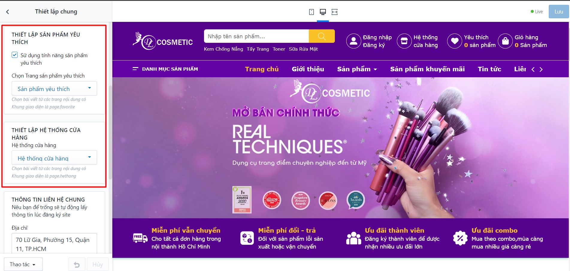 Tại đây bạn có thể thiết lập các tiêu đề, menu, kết nối mạng xã hội vv...
