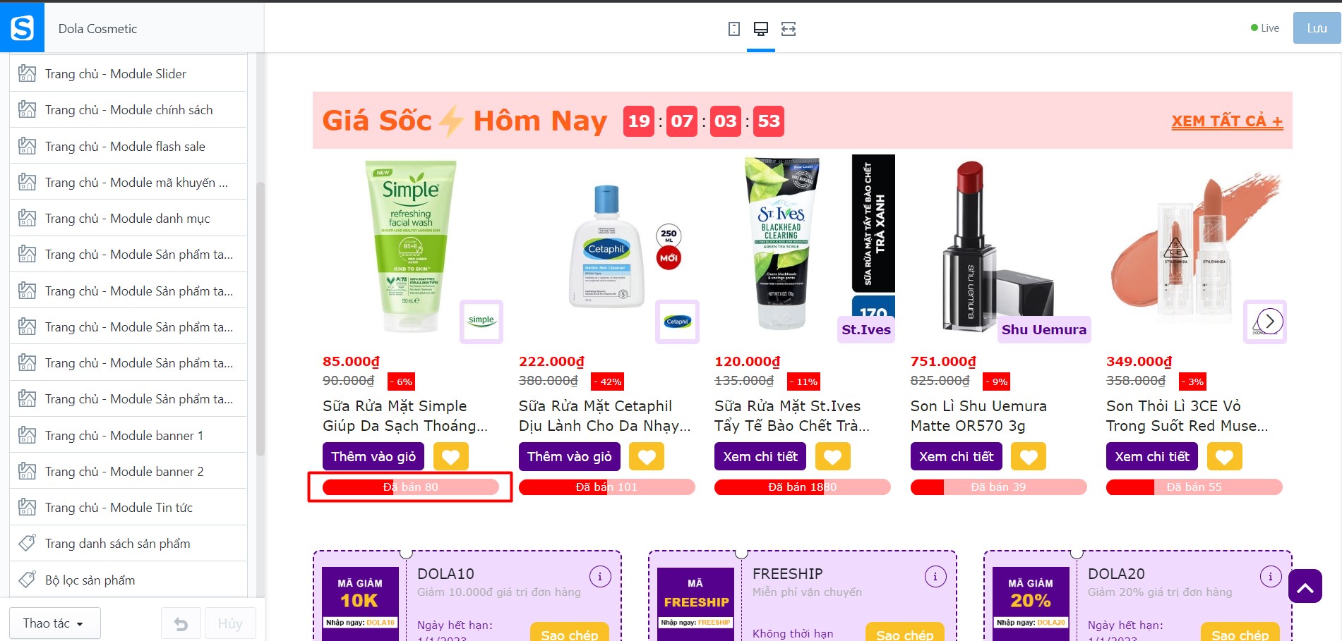 Để thiết lập số lượng đã bán, trong sản phẩm bạn nhập tag soluong_số lượng để lấy số lượng tồn kho ban đầu.