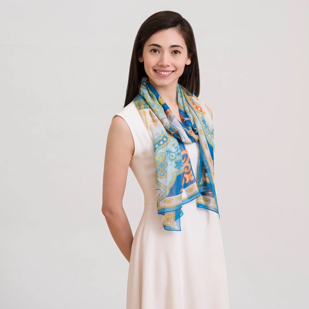 Chiếc khăn mềm mại này là sản phẩm được truyền cảm hứng từ tiết mục múa Lòng mến khách của người Mông Cổ (Mongolian Hospitality) của Đoàn Nghệ thuật Biểu diễn Shen Yun, trong đó các thiếu nữ Mông Cổ chào đón những vị khách quý bằng một điệu nhảy sôi nổi trên cánh đồng cỏ rộng lớn dưới bầu trời thảo nguyên trong xanh bao la.