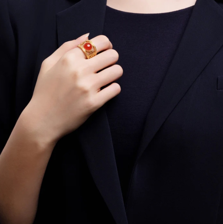 Mỗi chiếc nhẫn còn mang theo biểu tượng nổi tiếng về vẻ đẹp “Quốc sắc thiên hương” dưới thời nhà Đường chính là hoa mẫu đơn. “Nữ hoàng của các loài hoa” trong ánh vàng kim kiêu sa sẽ làm rạng ngời phong cách và sự quý phái của bạn bất kể nơi đâu.
