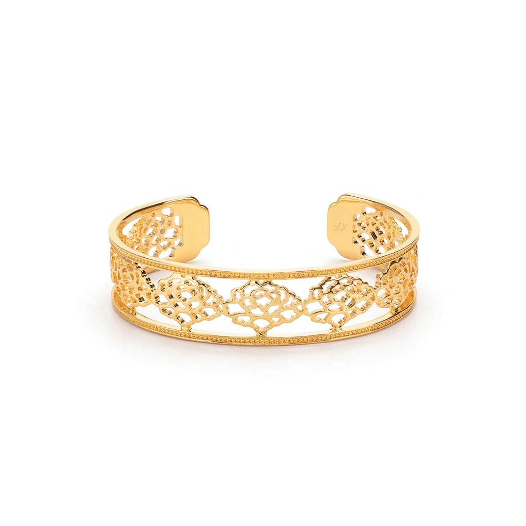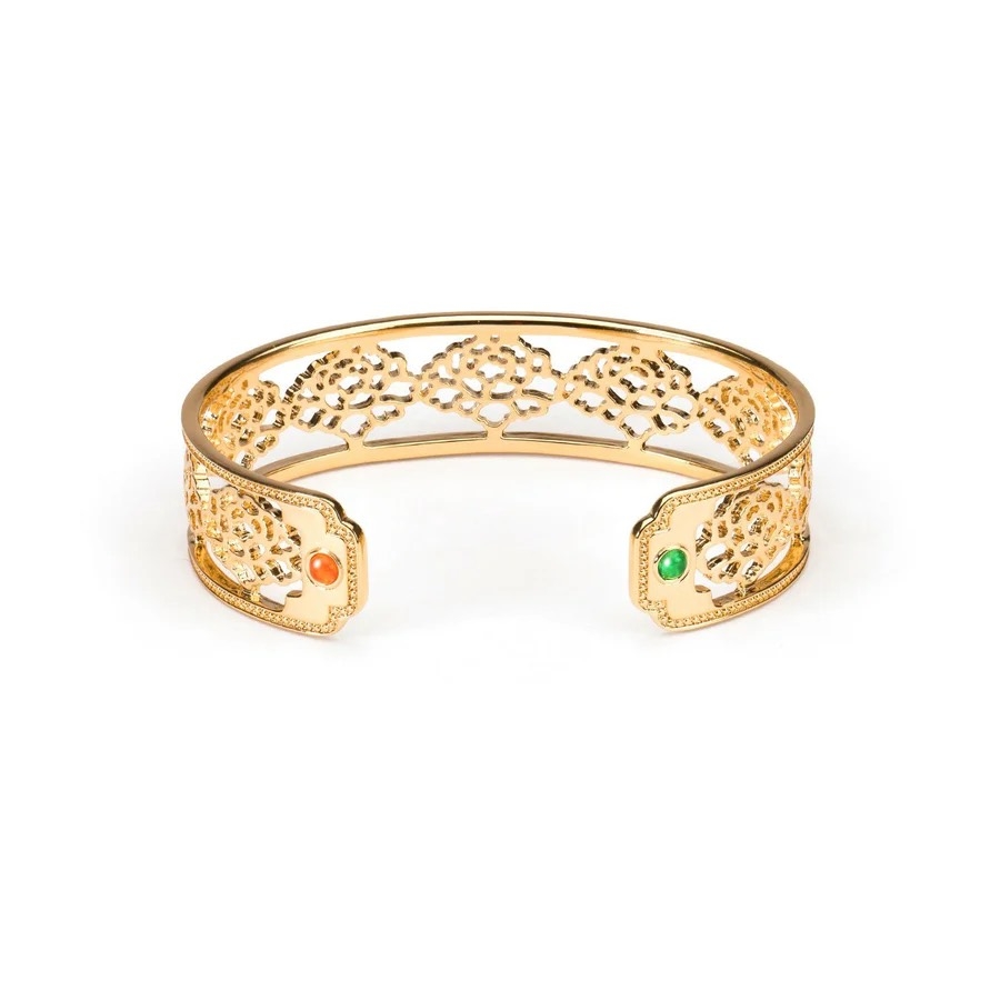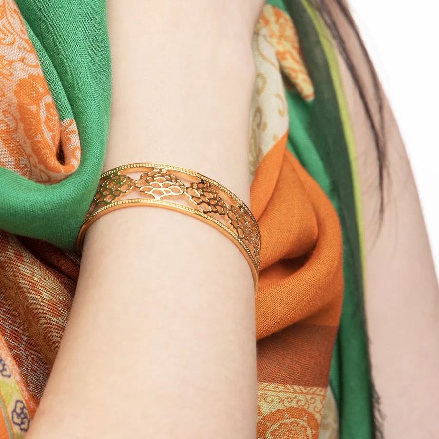 Được truyền cảm hứng từ trang phục trong tiết mục múa Vẻ thanh nhã nhà Đường (Tang Dynasty Grace) của Đoàn Nghệ thuật Biểu diễn Shen Yun, chiếc vòng đeo tay Hoa Nhà Đường là món phụ kiện sở hữu một thiết kế trường tồn với thời gian. Bạn sẽ trở nên lộng lẫy và duyên dáng hơn khi kết hợp chiếc vòng đeo tay này cùng dây chuyền và đôi bông tai Hoa Nhà Đường của chúng tôi.